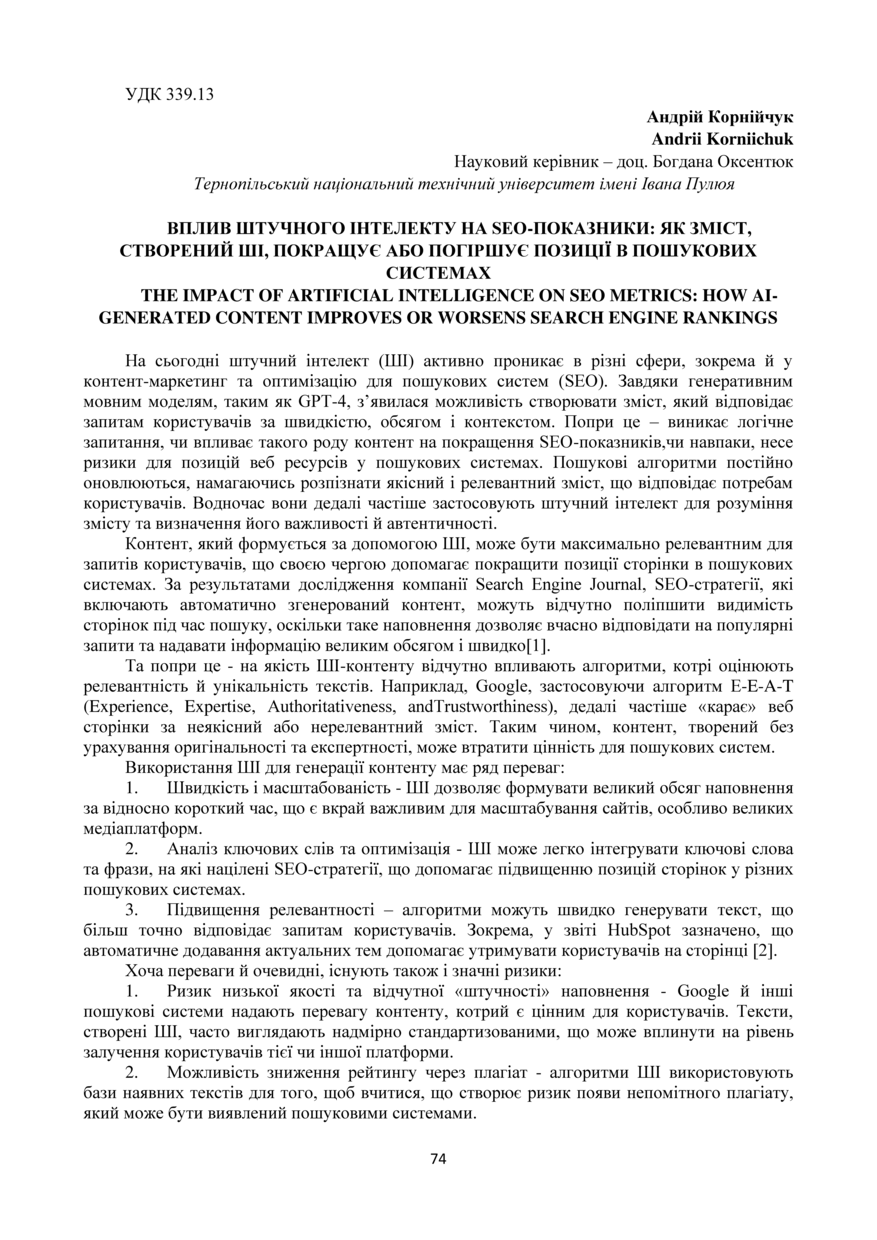 | Bibliographic citation (CHICAGO): | Korniichuk A. (2024) Vplyv shtuchnoho intelektu na SEO-pokaznyky: yak zmist, stvorenyi ShI, pokrashchuie abo pohirshuie pozytsii v poshukovykh systemakh [The impact of artificial intelligence on SEO metrics: how AI-generated content improves or worsens search engine rankings]. Materials of the Ⅲ All-Ukrainian scientific and practical Internet conference ‘Marketing technologies of enterprises in the modern scientific and technical environment’ (Tern., 29 November 2014), pp. 74-75 [in Ukrainian]. |