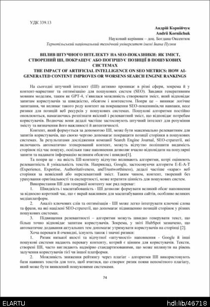 | Bibliographic citation (APA): | Korniichuk, A. (2024). Vplyv shtuchnoho intelektu na SEO-pokaznyky: yak zmist, stvorenyi ShI, pokrashchuie abo pohirshuie pozytsii v poshukovykh systemakh [The impact of artificial intelligence on SEO metrics: how AI-generated content improves or worsens search engine rankings]. Materials of the Ⅲ All-Ukrainian scientific and practical Internet conference ‘Marketing technologies of enterprises in the modern scientific and technical environment’, 29 November 2014, Ternopil, 74-75. TNTU. [in Ukrainian]. |