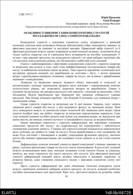 | Bibliographic citation (APA): | Prokopiv, Y. (2024). Osoblyvosti vykorystannia konkurentnykh stratehii [Peculiarities of using competivesrategies]. Materials of the Ⅲ All-Ukrainian scientific and practical Internet conference ‘Marketing technologies of enterprises in the modern scientific and technical environment’, 29 November 2014, Ternopil, 92-93. TNTU. [in Ukrainian]. |