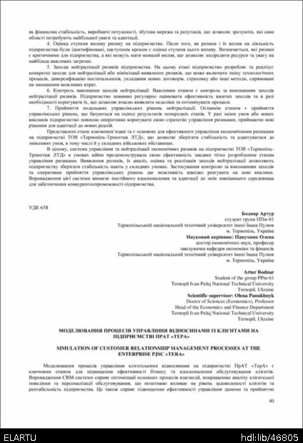 | Bibliographic citation (APA): | Bodnar, A. (2024). Modeliuvannia protsesiv upravlinnia vidnosynamy iz kliientamy na pidpryiemstvi PrAT "TERA" [Simulation of customer relationship management processes at the enterprise PJSC «TERA»]. Proceedings of the 13 International Scientific-Practical Conference “Formation of the mechanism of national economic systems competitive positions strengthening in global, regional and local dimensions”, 25 November 2024, Ternopil, 40-42. [in Ukrainian]. |