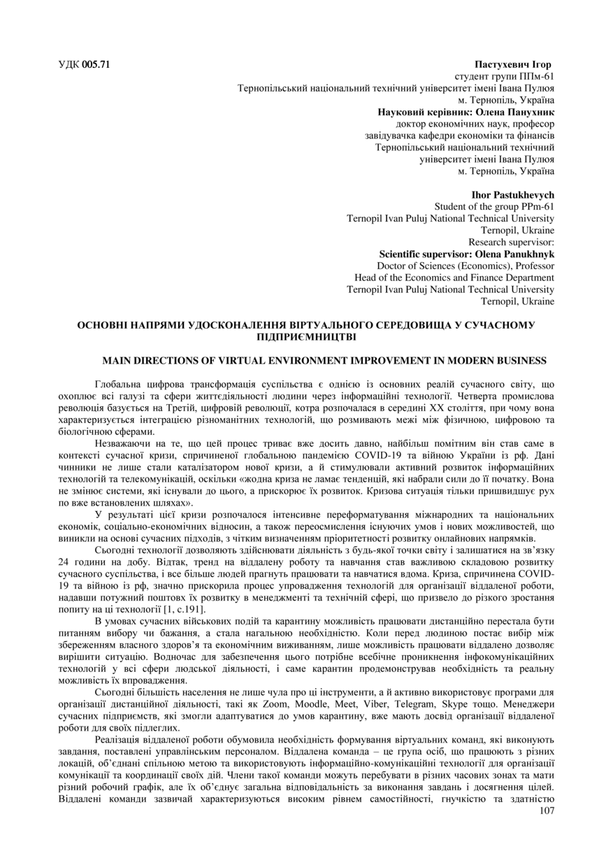 | Bibliographic citation (APA): | Pastukhevych, I. (2024). Osnovni napriamy udoskonalennia virtualnoho seredovyshcha u suchasnomu pidpryiemnytstvi [Main directions of virtual environment improvement in modern business]. Proceedings of the 13 International Scientific-Practical Conference “Formation of the mechanism of national economic systems competitive positions strengthening in global, regional and local dimensions”, 25 November 2024, Ternopil, 107-109. [in Ukrainian]. |