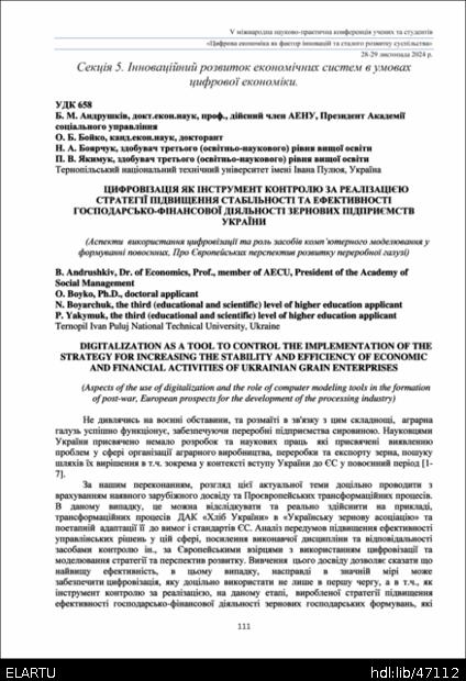 | Bibliographic citation (APA): | Andrushkiv, B., Boyko, O., Boyarchuk, N., & Yakymuk, P. (2024). Tsyfrovizatsiia yak instrument kontroliu za realizatsiieiu stratehii pidvyshchennia stabilnosti ta efektyvnosti hospodarsko-finansovoi diialnosti zernovykh pidpryiemstv Ukrainy (Aspekty vykorystannia tsyfrovizatsii ta rol zasobiv kompiuternoho modeliuvannia u formuvanni povoiennykh, Pro Yevropeiskykh perspektyv rozvytku pererobnoi haluzi) [Digitalization as a tool to control the implementation of the strategy for increasing the stability and efficiency of economic and financial activities of ukrainian grain enterprises (Aspects of the use of digitalization and the role of computer modeling tools in the formation of post-war, European prospects for the development of the processing industry)]. Abstracts of the Ⅴ International Scientific and Practical Conference of Scientists and Students ‘Digital Economy as a Factor of Innovation and Sustainable Development of Society’, November 28-29, 2024, Ternopil, 111-113. TNTU. [in Ukrainian]. |