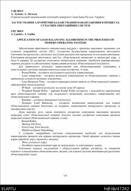 | Bibliographic citation (APA): | Lutskiv, A., & Liulka, A. (2024). Zastosuvannia alhorytmiv balansuvannia navantazhennia v protsesakh suchasnykh operatsiinykh system [Application of load balancing algorithms in the processes of modern operating systems]. Materials of the Ⅻ scientific and technical conference ‘Information models, systems and technologies’, 18-19 December 2024, Ternopil, 141. TNTU. [in Ukrainian]. |