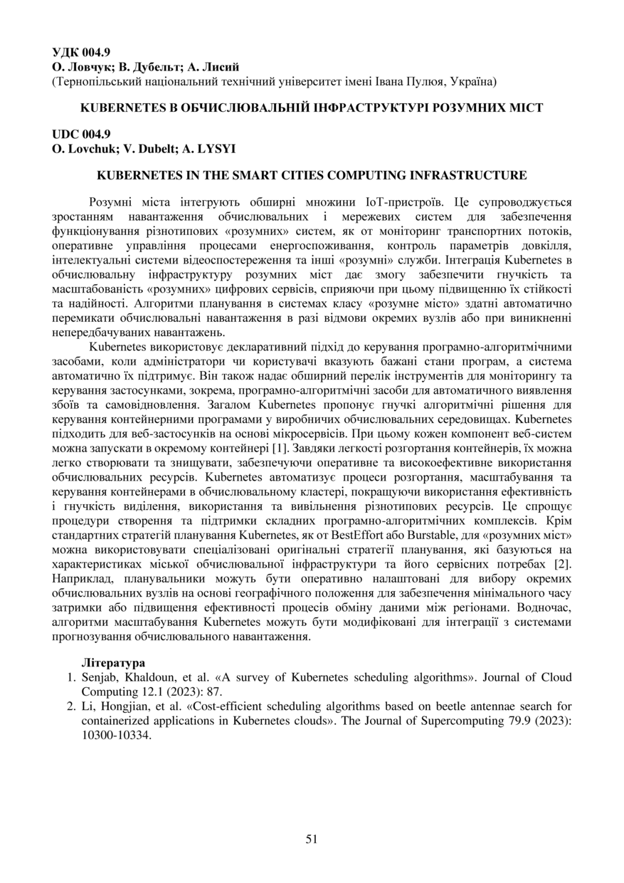 | Bibliographic citation (APA): | Lovchuk, O., Dubelt, V., & Lysyi, A. (2024). Kubernetes v obchysliuvalnii infrastrukturi rozumnykh mist [Kubernetes in the smart cities computing infrastructure]. Materials of the Ⅻ scientific and technical conference ‘Information models, systems and technologies’, 18-19 December 2024, Ternopil, 51. TNTU. [in Ukrainian]. |