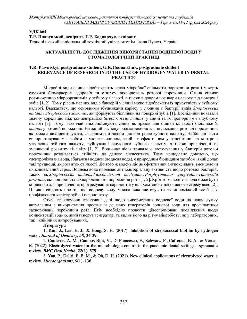| Bibliographic citation (APA): | Plavutskyi, T. R., & Bodnarchuk, G. R. (2024). Aktualnist doslidzhennia vykorystannia vodnevoi vody u stomatolohichnii praktytsi [Relevance of research into the use of hydrogen water in dental practice]. Book of abstracts of the ⅩⅢ International scientific and practical conference of young researchers and students „Current issues in modern technologies“, 11-12 December 2024, Ternopil, 357. [in Ukrainian]. |