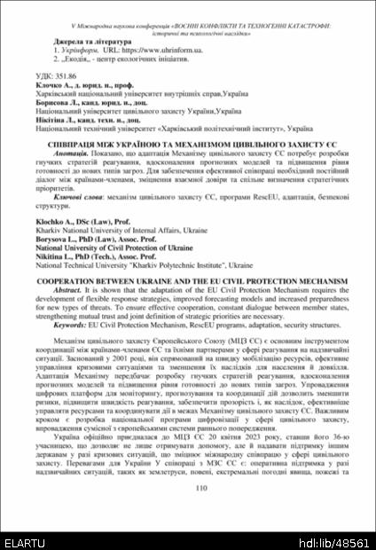 | Bibliographic citation (APA): | Klochko, A., Borysova, L., & Nikitina, L. (2025). Spivpratsia mizh Ukrainoiu ta mekhanizmom tsyvilnoho zakhystu YeS [Cooperation between Ukraine and the EU civil protection mechanism]. 5th International Scientific Conference "Military Conflicts and Technogenic Disasters: Historical and Psychological Consequences", 15-16 April 2025, Ternopil, 110-112. PE Palianytsia V.A.. [in Ukrainian]. |