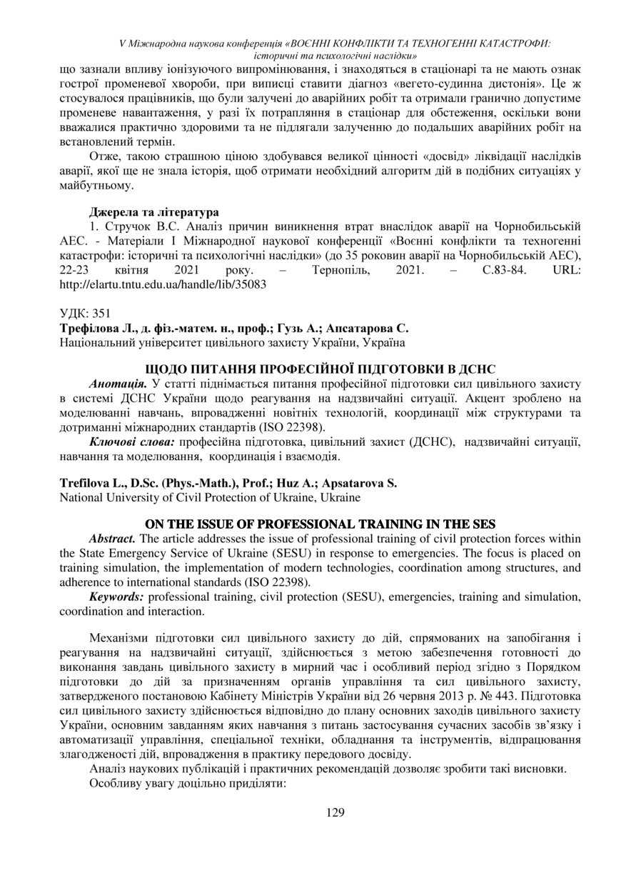 | Bibliographic citation (APA): | Trefilova, L., Huz, A., & Apsatarova, S. (2025). Shchodo pytannia profesiinoi pidhotovky v DSNS [On the issue of professional training in the SES]. 5th International Scientific Conference "Military Conflicts and Technogenic Disasters: Historical and Psychological Consequences", 15-16 April 2025, Ternopil, 129-131. PE Palianytsia V.A.. [in Ukrainian]. |