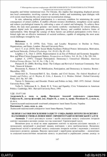 | Bibliographic citation (APA): | Andrushkiv, B., Habrusieva, N., Kyrych, N., Pohaydak, O., & Panchyshyn, T. (2025). Shliakhy i zasoby posylennia zakhystu sotsialnykh interesiv osvitian i naukovtsiv v umovakh povoiennoi yevrointehratsii osvitianskoi haluzi [Ways and means of strengthening the protection of social interests of educators and scientists in the context of post-war european integration of the educational sector]. 5th International Scientific Conference "Military Conflicts and Technogenic Disasters: Historical and Psychological Consequences", 15-16 April 2025, Ternopil, 147-150. PE Palianytsia V.A.. [in Ukrainian]. |