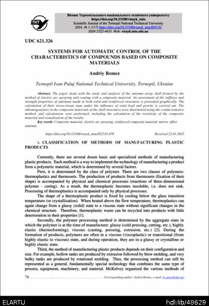 | Bibliographic citation (APA): | Remez, A. (2025). Systemy avtomatychnoho kontroliu za kharakterystykamy spoluk na osnovi kompozytnykh materialiv [Systems for automatic control of the characteristics of compounds based on composite materials]. Scientific Journal of the Ternopil National Technical University, 117(1), 76-86. TNTU. [in Ukrainian]. |