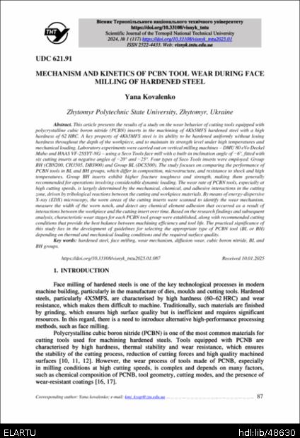 | Bibliographic citation (APA): | Kovalenko, Y. (2025). Mekhanizm ta kinetyka znoshuvannia instrumentu z PKNB pry tortsevomu frezeruvanni zahartovanoi stali [Mechanism and kinetics of PCBN tool wear during face milling of hardened steel]. Scientific Journal of the Ternopil National Technical University, 117(1), 87-97. TNTU. [in Ukrainian]. |