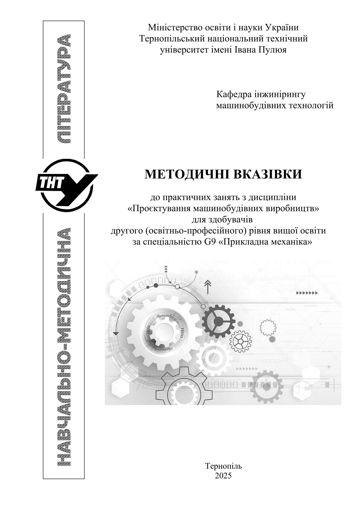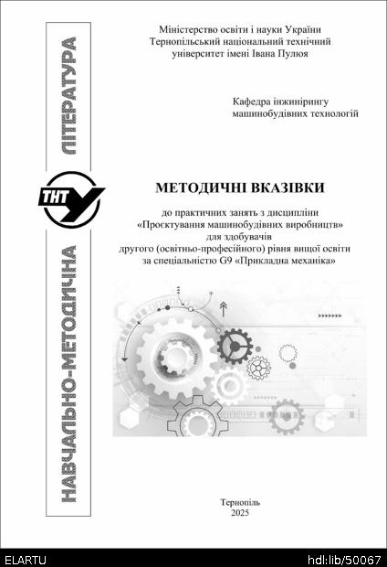 Title: | Методичні вказівки до практичних занять з дисципліни «Проєктування машинобудівних виробництв» для здобувачів другого (освітньо-професійного) рівня вищої освіти за спеціальністю G9 Прикладна механіка / Укладачі : Комар Р.В., Окіпний І.Б. – Тернопіль : 2025. – 36 с. |