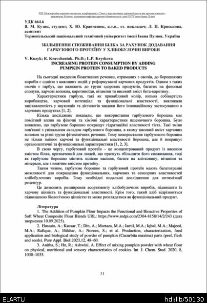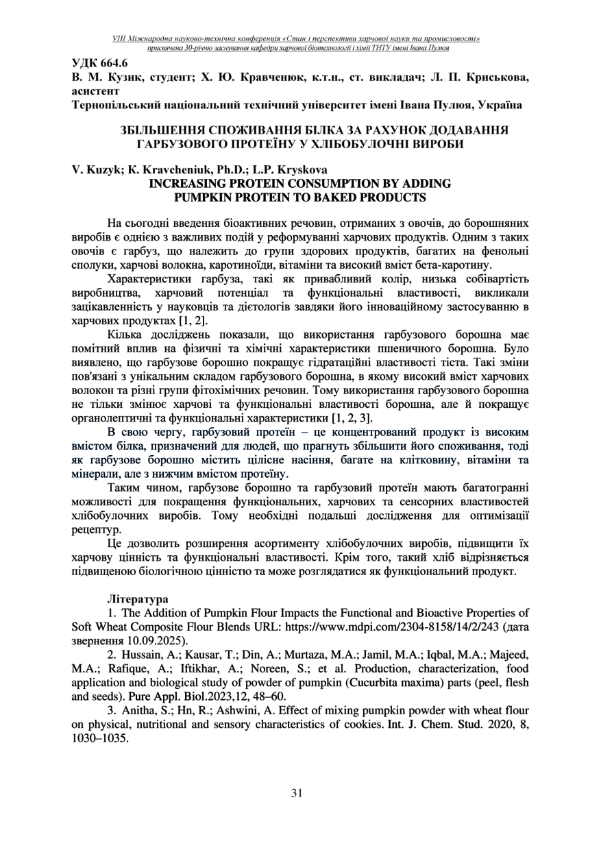 | Bibliographic citation (APA): | Kuzyk, V., Kravcheniuk, K., & Kryskova, L. P. (2025). Zbilshennia spozhyvannia bilka za rakhunok dodavannia harbuzovoho proteinu u khlibobulochni vyroby [Increasing protein consumption by adding pumpkin protein to baked products]. Materials of the 8th International Scientific and Technical Conference “The State and Prospects of Food Science and Industry” dedicated to the 30th anniversary of the founding of the Department of Food Biotechnology and Chemistry at Ivan Pulʼuj Ternopil National Technical University, 25 – 26 veresnia 2025 y., Ternopil, 31. [in Ukrainian]. |