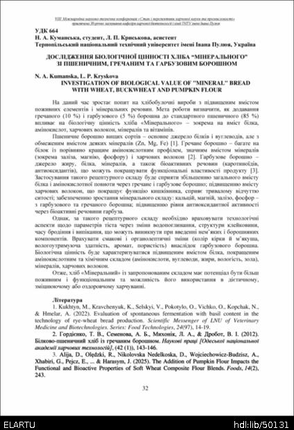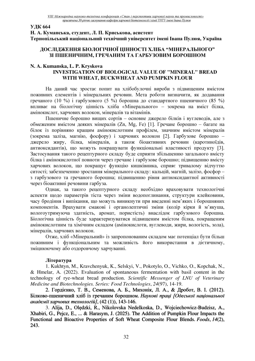 | Bibliographic citation (APA): | Kumanska, N. A., & Kryskova, L. P. (2025). Doslidzhennia biolohichnoi tsinnosti khliba "mineralnoho" zi pshenychnym, hrechanym ta harbuzovym boroshnom [Investigation of biological value of "mineral" bread with wheat, buckwheat and pumpkin flour]. Materials of the 8th International Scientific and Technical Conference “The State and Prospects of Food Science and Industry” dedicated to the 30th anniversary of the founding of the Department of Food Biotechnology and Chemistry at Ivan Pulʼuj Ternopil National Technical University, 25 – 26 veresnia 2025 y., Ternopil, 32. [in Ukrainian]. |