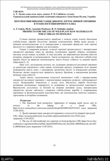 | Bibliographic citation (APA): | Lialyk, A. T., & Stsibailo, R. O. (2025). Perspektyvy vykorystannia dykorosloi roslynnoi syrovyny v tekhnolohii pshenychnoho khliba [Prospects for the use of wild plant raw materials in wheat bread technology]. Materials of the 8th International Scientific and Technical Conference “The State and Prospects of Food Science and Industry” dedicated to the 30th anniversary of the founding of the Department of Food Biotechnology and Chemistry at Ivan Pulʼuj Ternopil National Technical University, 25 – 26 veresnia 2025 y., Ternopil, 33. [in Ukrainian]. |