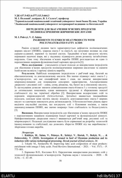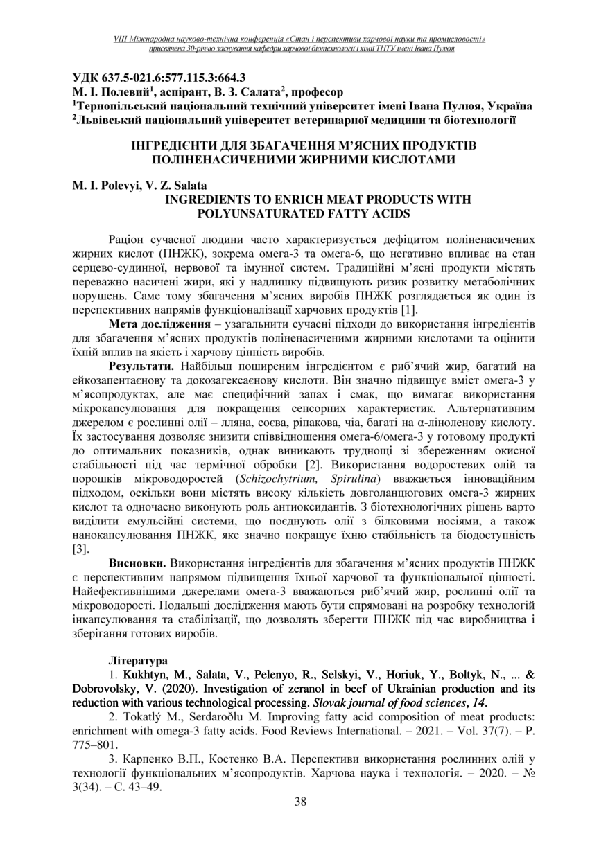 | Bibliographic citation (APA): | Polevyi, M. I., & Salata, V. Z. (2025). Inhrediienty dlia zbahachennia miasnykh produktiv polinenasychenymy zhyrnymy kyslotamy [Ingredients to enrich meat products with polyunsaturated fatty acids]. Materials of the 8th International Scientific and Technical Conference “The State and Prospects of Food Science and Industry” dedicated to the 30th anniversary of the founding of the Department of Food Biotechnology and Chemistry at Ivan Pulʼuj Ternopil National Technical University, 25 – 26 veresnia 2025 y., Ternopil, 38. [in Ukrainian]. |