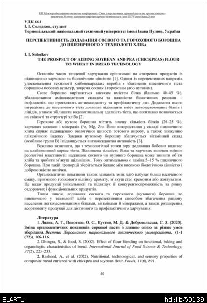 | Bibliographic citation (APA): | Solodkov, I. I. (2025). Perspektyvnist dodavannia soievoho ta horokhovoho boroshna do pshenychnoho u tekhnolohii khliba [The prospect of adding soybean and pea (chickpeas) flour to wheat in bread technology]. Materials of the 8th International Scientific and Technical Conference “The State and Prospects of Food Science and Industry” dedicated to the 30th anniversary of the founding of the Department of Food Biotechnology and Chemistry at Ivan Pulʼuj Ternopil National Technical University, 25 – 26 veresnia 2025 y., Ternopil, 40. [in Ukrainian]. |
