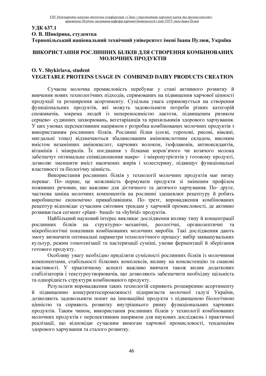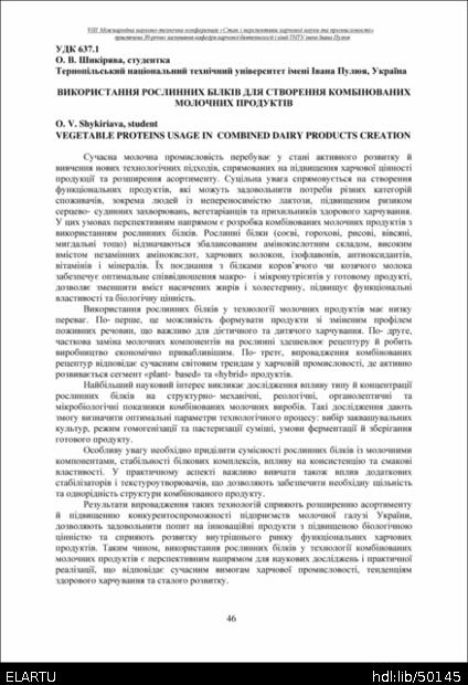 | Bibliographic citation (APA): | Shykiriava, O. V. (2025). Vykorystannia roslynnykh bilkiv dlia stvorennia kombinovanykh molochnykh produktiv [Vegetable proteins usage in combined dairy products creation]. Materials of the 8th International Scientific and Technical Conference “The State and Prospects of Food Science and Industry” dedicated to the 30th anniversary of the founding of the Department of Food Biotechnology and Chemistry at Ivan Pulʼuj Ternopil National Technical University, 25 – 26 veresnia 2025 y., Ternopil, 46. [in Ukrainian]. |