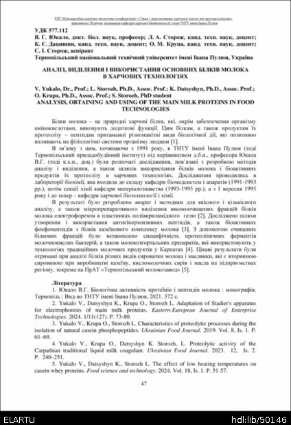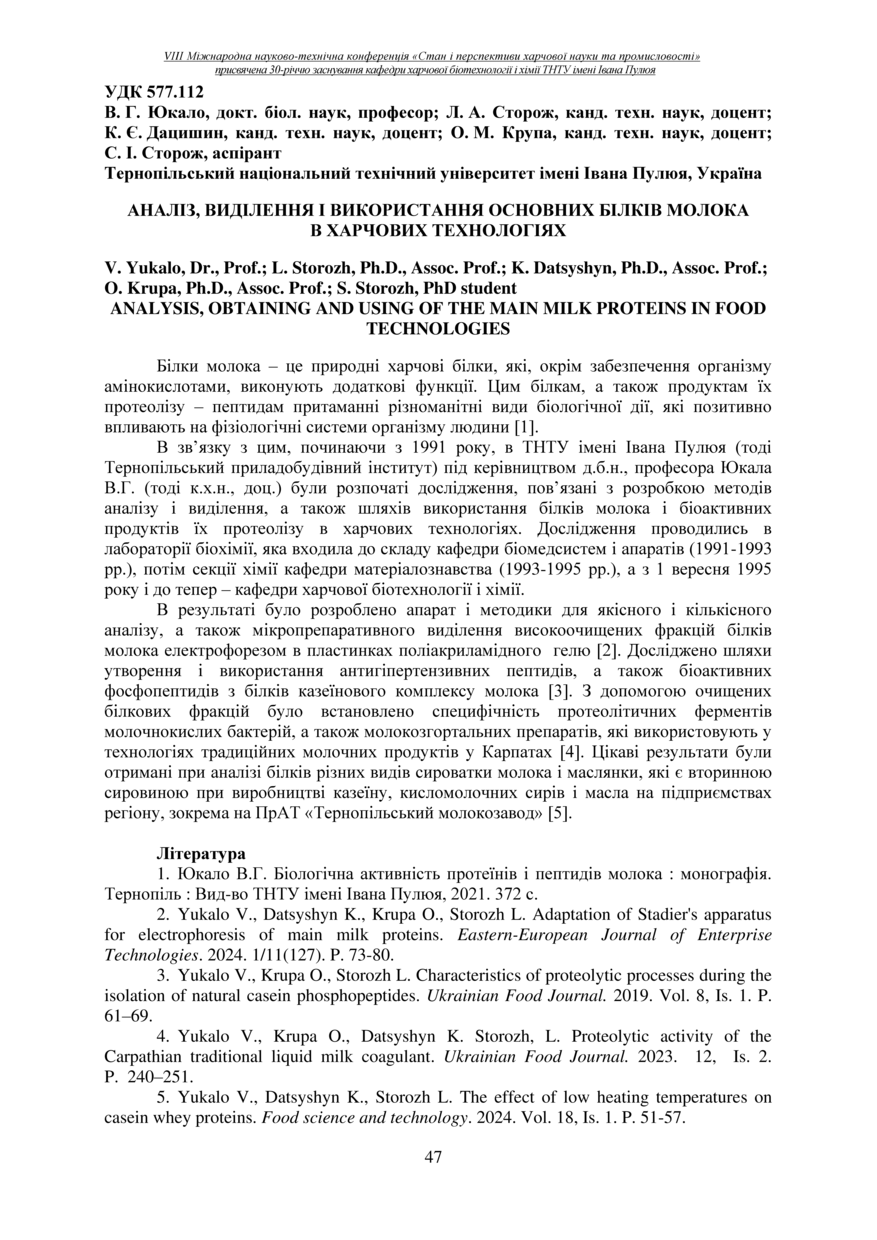 | Bibliographic citation (APA): | Yukalo, V., Storozh, L., Datsyshyn, K., Krupa, O., & Storozh, S. (2025). Analiz, vydilennia i vykorystannia osnovnykh bilkiv moloka v kharchovykh tekhnolohiiakh [Analysis, obtaining and using of the main milk proteins in food technologies]. Materials of the 8th International Scientific and Technical Conference “The State and Prospects of Food Science and Industry” dedicated to the 30th anniversary of the founding of the Department of Food Biotechnology and Chemistry at Ivan Pulʼuj Ternopil National Technical University, 25 – 26 veresnia 2025 y., Ternopil, 47. [in Ukrainian]. |