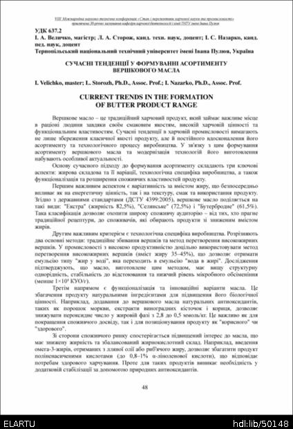 | Bibliographic citation (APA): | Velichko, I., Storozh, L., & Nazarko, I. (2025). Suchasni tendentsii u formuvanni asortymentu vershkovoho masla [Current trends in the formation of butter product range]. Materials of the 8th International Scientific and Technical Conference “The State and Prospects of Food Science and Industry” dedicated to the 30th anniversary of the founding of the Department of Food Biotechnology and Chemistry at Ivan Pulʼuj Ternopil National Technical University, 25 – 26 veresnia 2025 y., Ternopil, 48-49. [in Ukrainian]. |