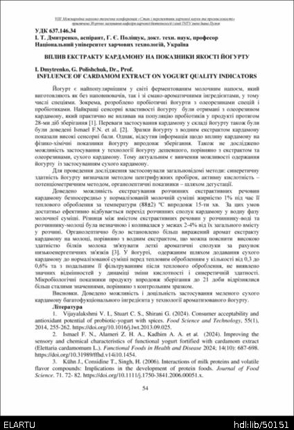 | Bibliographic citation (APA): | Dmytrenko, I., & Polishchuk, G. (2025). Vplyv ekstraktu kardamonu na pokaznyky yakosti yohurtu [Influence of cardamom extract on yogurt quality indicators]. Materials of the 8th International Scientific and Technical Conference “The State and Prospects of Food Science and Industry” dedicated to the 30th anniversary of the founding of the Department of Food Biotechnology and Chemistry at Ivan Pulʼuj Ternopil National Technical University, 25 – 26 veresnia 2025 y., Ternopil, 54. [in Ukrainian]. |