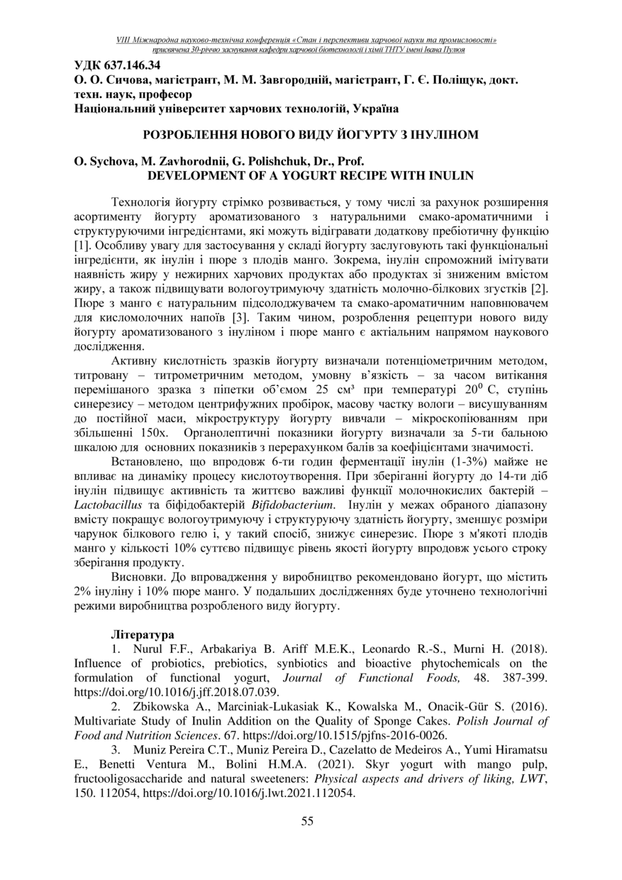 | Bibliographic citation (APA): | Sychova, O., Zavhorodnii, M., & Polishchuk, G. (2025). Rozroblennia novoho vydu yohurtu z inulinom [Development of a yogurt recipe with inulin]. Materials of the 8th International Scientific and Technical Conference “The State and Prospects of Food Science and Industry” dedicated to the 30th anniversary of the founding of the Department of Food Biotechnology and Chemistry at Ivan Pulʼuj Ternopil National Technical University, 25 – 26 veresnia 2025 y., Ternopil, 55. [in Ukrainian]. |