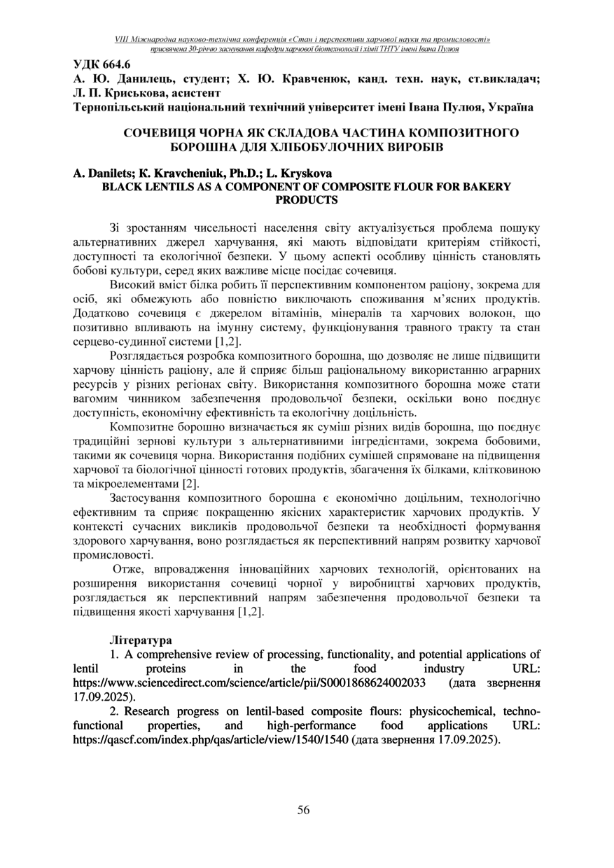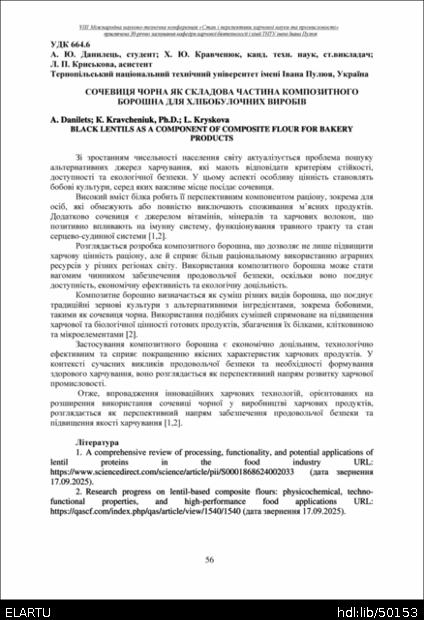 | Bibliographic citation (APA): | Danilets, A., Kravcheniuk, K., & Kryskova, L. (2025). Sochevytsia chorna yak skladova chastyna kompozytnoho boroshna dlia khlibobulochnykh vyrobiv [Black lentils as a component of composite flour for bakery products]. Materials of the 8th International Scientific and Technical Conference “The State and Prospects of Food Science and Industry” dedicated to the 30th anniversary of the founding of the Department of Food Biotechnology and Chemistry at Ivan Pulʼuj Ternopil National Technical University, 25 – 26 veresnia 2025 y., Ternopil, 56. [in Ukrainian]. |