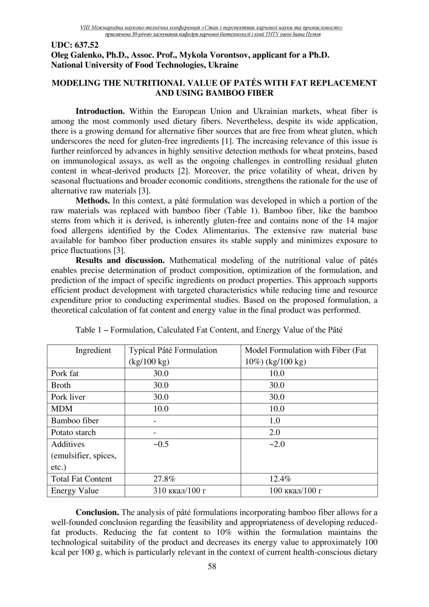 | Bibliographic reference (2015): | Galenko O., Vorontsov M. Modeling the nutritional value of patés with fat replacement and using bamboo fiber // Materials of the 8th International Scientific and Technical Conference “The State and Prospects of Food Science and Industry” dedicated to the 30th anniversary of the founding of the Department of Food Biotechnology and Chemistry at Ivan Pulʼuj Ternopil National Technical University, Ternopil, 25 – 26 вересня 2025 р. 2025. P. 58–59. |