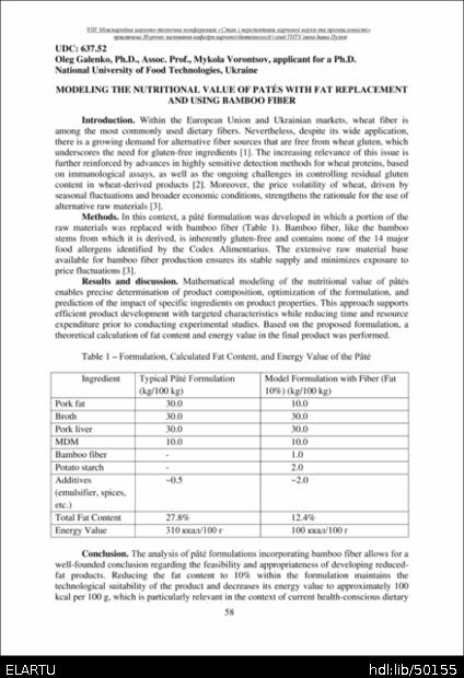 | Bibliographic citation (APA): | Galenko, O., & Vorontsov, M. (2025). Modeling the nutritional value of patés with fat replacement and using bamboo fiber. Materials of the 8th International Scientific and Technical Conference “The State and Prospects of Food Science and Industry” dedicated to the 30th anniversary of the founding of the Department of Food Biotechnology and Chemistry at Ivan Pulʼuj Ternopil National Technical University, 25 – 26 veresnia 2025 y., Ternopil, 58-59.. |