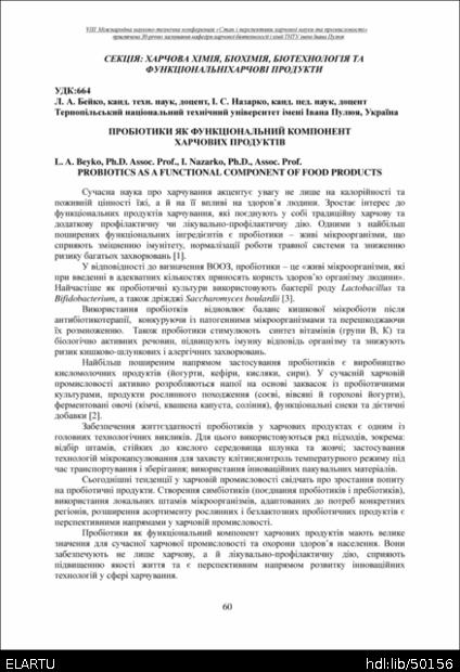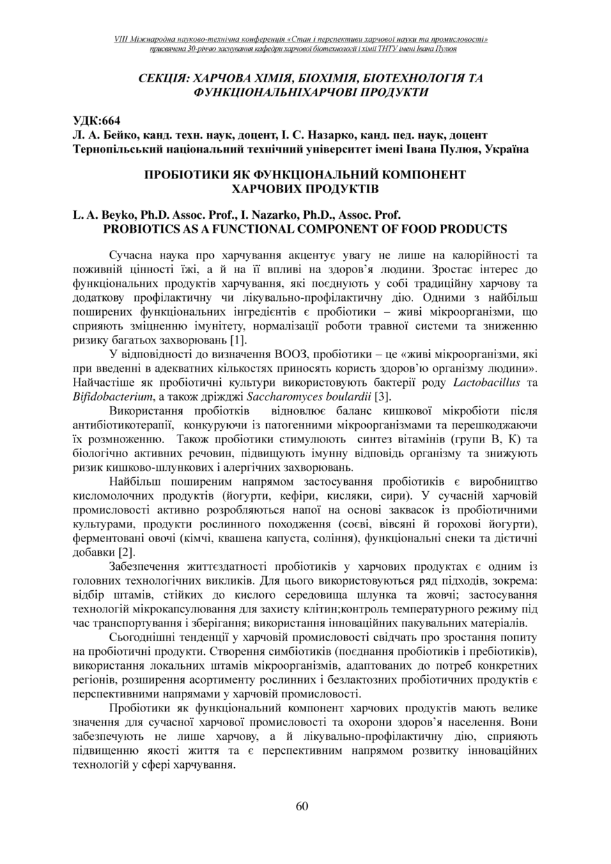 Bibliographic citation (CHICAGO): Beyko L. A., Nazarko I. (2025) Probiotyky yak funktsionalnyi komponent kharchovykh produktiv [Probiotics as a functional component of food products]. Materials of the 8th International Scientific and Technical Conference “The State and Prospects of Food Science and Industry” dedicated to the 30th anniversary of the founding of the Department of Food Biotechnology and Chemistry at Ivan Pulʼuj Ternopil National Technical University (Tern., 25 – 26 veresnia 2025 y.), pp. 60-61 [in Ukrainian].