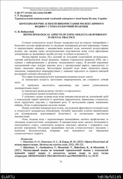 | Bibliographic citation (APA): | Bodnarchuk, G. R. (2025). Biotekhnolohichni aspekty vykorystannia molekuliarnoho vodniu u stomatolohichnii praktytsi [Biotechnological aspects of using molecular hydrogen in dental practice]. Materials of the 8th International Scientific and Technical Conference “The State and Prospects of Food Science and Industry” dedicated to the 30th anniversary of the founding of the Department of Food Biotechnology and Chemistry at Ivan Pulʼuj Ternopil National Technical University, 25 – 26 veresnia 2025 y., Ternopil, 74. [in Ukrainian]. |