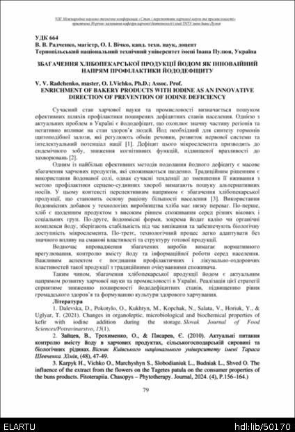 | Bibliographic citation (APA): | Radchenko, V. V., & Vichko, O. I. (2025). Zbahachennia khlibopekarskoi produktsii yodom yak innovaiinyi napriam profilaktyky yododefitsytu [Enrichment of bakery products with iodine as an innovative direction of prevention of iodine deficiency]. Materials of the 8th International Scientific and Technical Conference “The State and Prospects of Food Science and Industry” dedicated to the 30th anniversary of the founding of the Department of Food Biotechnology and Chemistry at Ivan Pulʼuj Ternopil National Technical University, 25 – 26 veresnia 2025 y., Ternopil, 79. [in Ukrainian]. |