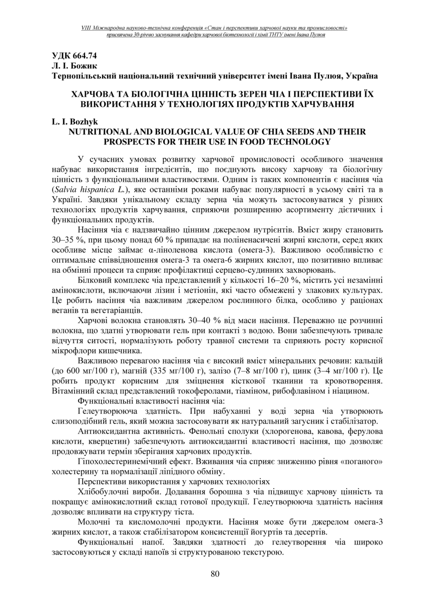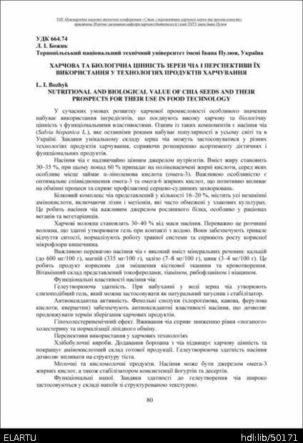 | Bibliographic citation (APA): | Bozhyk, L. I. (2025). Kharchova ta biolohichna tsinnist zeren chia i perspektyvy yikh vykorystannia u tekhnolohiiakh produktiv kharchuvannia [Nutritional and biological value of chia seeds and their prospects for their use in food technology]. Materials of the 8th International Scientific and Technical Conference “The State and Prospects of Food Science and Industry” dedicated to the 30th anniversary of the founding of the Department of Food Biotechnology and Chemistry at Ivan Pulʼuj Ternopil National Technical University, 25 – 26 veresnia 2025 y., Ternopil, 80-81. [in Ukrainian]. |