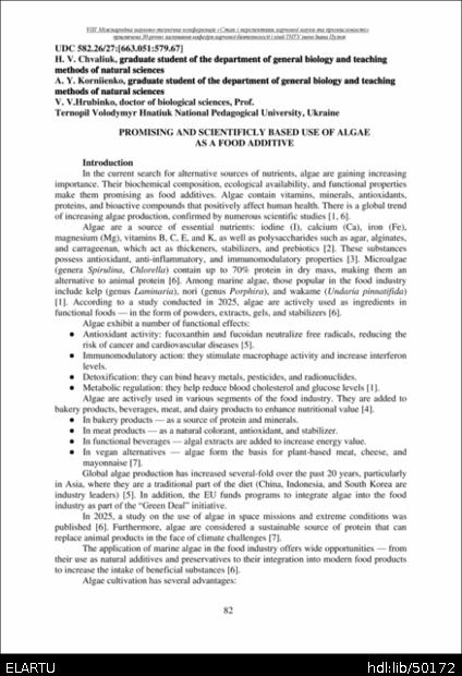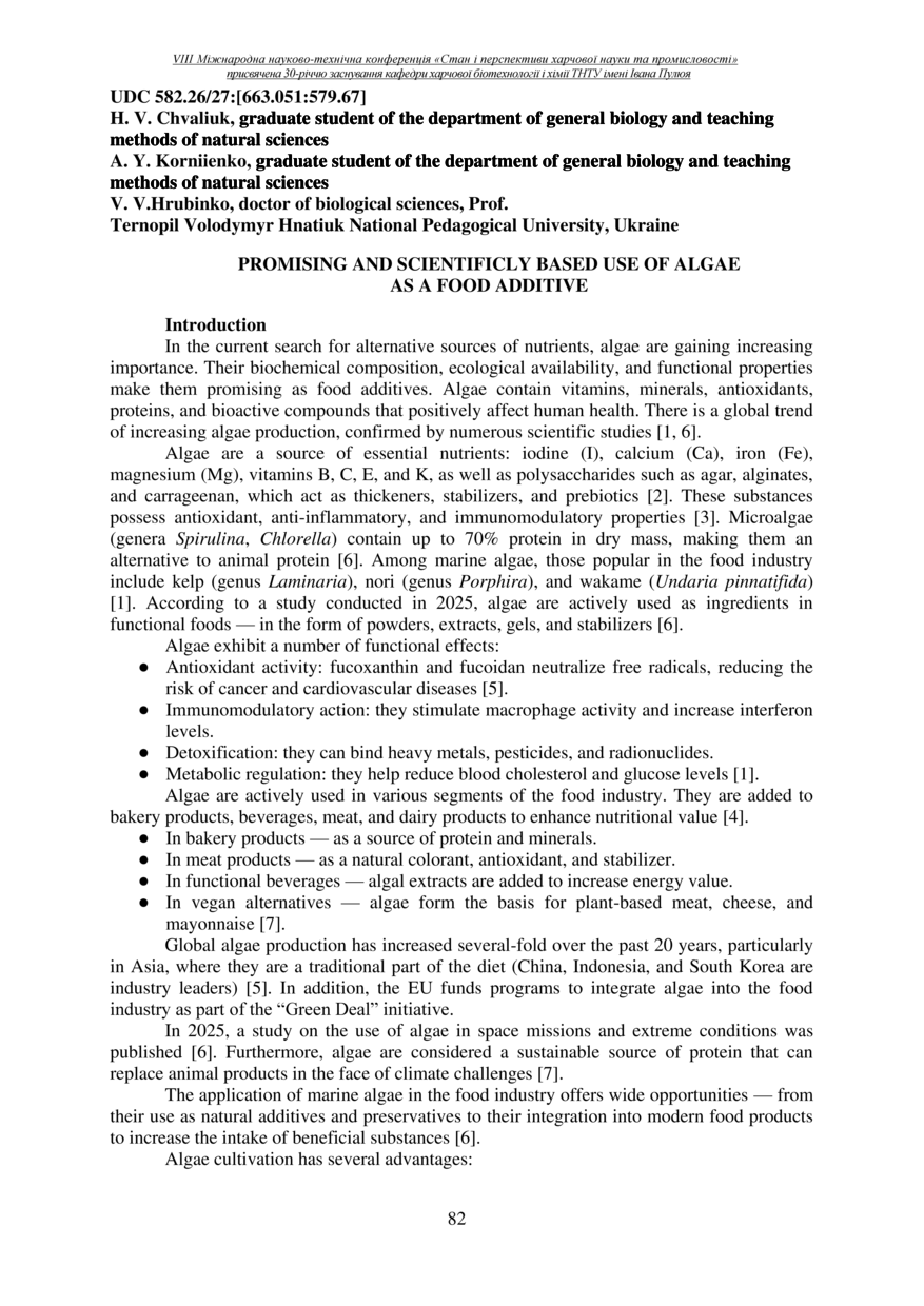 | Bibliographic citation (APA): | Chvaliuk, H. V., Korniienko, A. Y., & Hrubinko, V. V. (2025). Promising and scientificly based use of Algae as a food additive. Materials of the 8th International Scientific and Technical Conference “The State and Prospects of Food Science and Industry” dedicated to the 30th anniversary of the founding of the Department of Food Biotechnology and Chemistry at Ivan Pulʼuj Ternopil National Technical University, 25 – 26 veresnia 2025 y., Ternopil, 82-83.. |