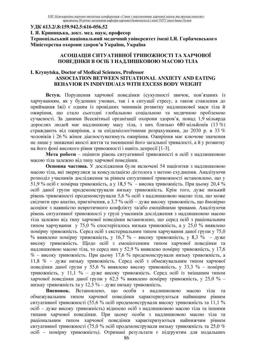 | Bibliographic citation (APA): | Krynytska, I. (2025). Asotsiatsiia sytuatyvnoi tryvozhnosti ta kharchovoi povedinky v osib z nadlyshkovoiu masoiu tila [Association between situational anxiety and eating behavior in individuals with excess body weight]. Materials of the 8th International Scientific and Technical Conference “The State and Prospects of Food Science and Industry” dedicated to the 30th anniversary of the founding of the Department of Food Biotechnology and Chemistry at Ivan Pulʼuj Ternopil National Technical University, 25 – 26 veresnia 2025 y., Ternopil, 86-87. [in Ukrainian]. |