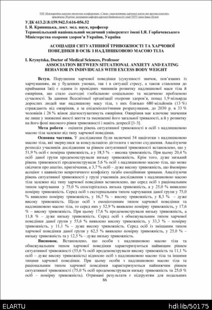 | Назва: | Асоціація ситуативної тривожності та харчової поведінки в осіб з надлишковою масою тіла |