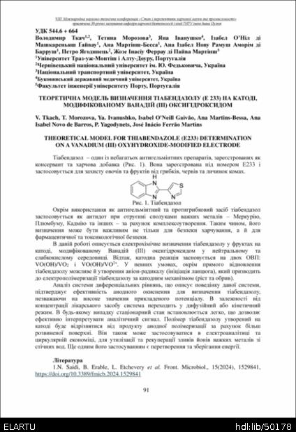 | Bibliographic citation (APA): | Tkach, V., Morozova, T., Ivanushko, Ya., Gaivão, I. O., Martins-Bessa, A., & Ana, Isabel Novo de Barros (2025). Teoretychna model vyznachennia tiabendazolu (E 233) na katodi, modyfikovanomu vanadii (III) oksyhidroksydom [Theoretical model for thiabendazole (E233) determination on a vanadium (III) oxyhydroxide-modified electrodE]. Materials of the 8th International Scientific and Technical Conference “The State and Prospects of Food Science and Industry” dedicated to the 30th anniversary of the founding of the Department of Food Biotechnology and Chemistry at Ivan Pulʼuj Ternopil National Technical University, 25 – 26 veresnia 2025 y., Ternopil, 91. [in Ukrainian]. |