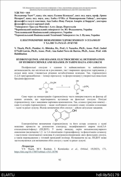 | Bibliographic citation (CHICAGO): | Tkach V., Biletska G., Nazarko I., Gaivão I. O., Ana Isabel Novo de Barros (2025) Elektrokhimichne vyznachennia hidroksykhinolu i sezamolu u khalvi ta rakhat-lukumi [Hydroxyquinol and sesamol electrochemical determination of hydrosychinole and sesamol in tahini halva and lokum]. Materials of the 8th International Scientific and Technical Conference “The State and Prospects of Food Science and Industry” dedicated to the 30th anniversary of the founding of the Department of Food Biotechnology and Chemistry at Ivan Pulʼuj Ternopil National Technical University (Tern., 25 – 26 veresnia 2025 y.), pp. 92 [in Ukrainian]. |