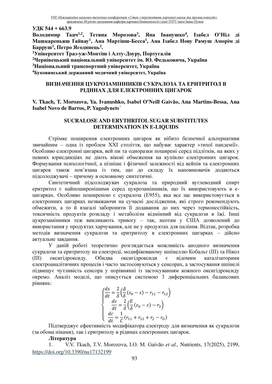 | Bibliographic reference (2015): | Визначення цукрозамінників сукралоза та еритритол в рідинах для електронних цигарок / Ткач В. та ін. // Матеріали Ⅷ Міжнародної науково-технічної конференції „Стан і перспективи харчової науки та промисловості“ присвяченої 30-річчю заснування кафедри харчової біотехнології і хімії ТНТУ імені Івана Пулюя, Тернопіль, 25 – 26 вересня 2025 р. 2025. С. 93. |