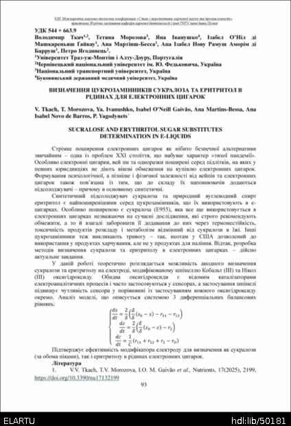 | Bibliographic citation (APA): | Tkach, V., Morozova, T., Ivanushko, Ya., Gaivão, I. O., Martins-Bessa, A., & Ana, Isabel Novo de Barros (2025). Vyznachennia tsukrozaminnykiv sukraloza ta erytrytol v ridynakh dlia elektronnykh tsyharok [Sucralose and erythritol sugar substitutes determination in e-liquids]. Materials of the 8th International Scientific and Technical Conference “The State and Prospects of Food Science and Industry” dedicated to the 30th anniversary of the founding of the Department of Food Biotechnology and Chemistry at Ivan Pulʼuj Ternopil National Technical University, 25 – 26 veresnia 2025 y., Ternopil, 93. [in Ukrainian]. |
