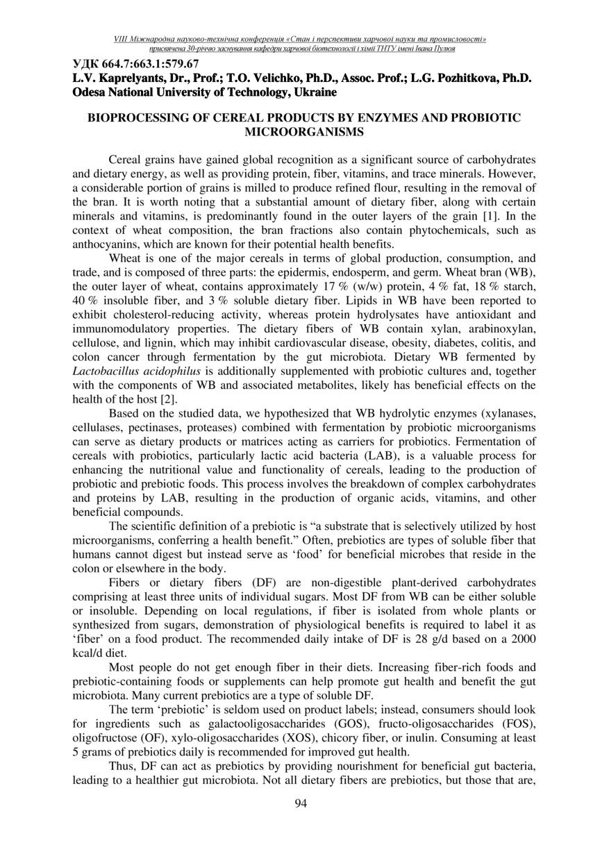| Bibliographic citation (APA): | Kaprelyants, L. V., Velichko, T. O., & Pozhitkova, L. G. (2025). Bioprocessing of cereal products by enzymes and probiotic microorganisms. Materials of the 8th International Scientific and Technical Conference “The State and Prospects of Food Science and Industry” dedicated to the 30th anniversary of the founding of the Department of Food Biotechnology and Chemistry at Ivan Pulʼuj Ternopil National Technical University, 25 – 26 veresnia 2025 y., Ternopil, 94-95.. |