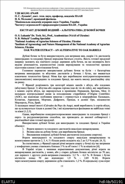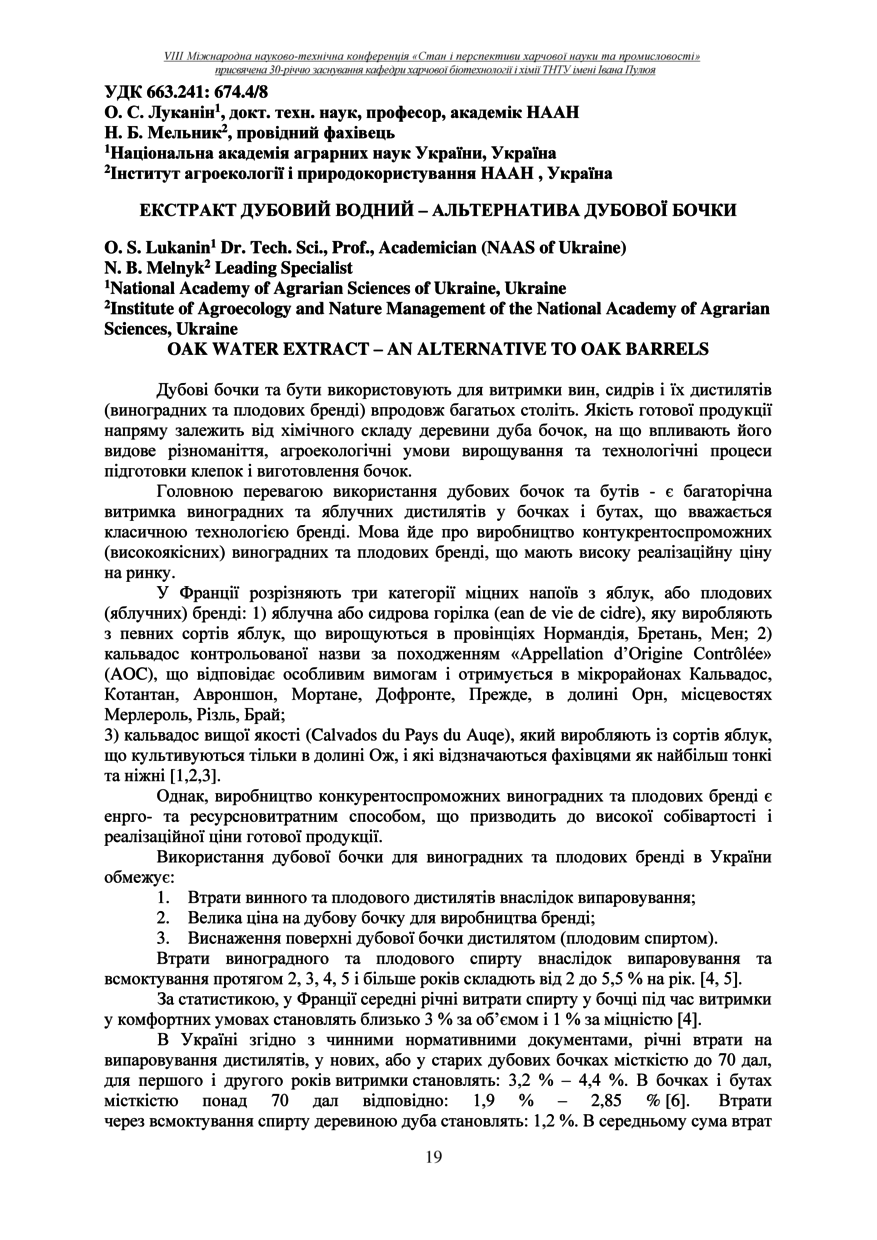 | Bibliographic citation (APA): | Lukanin, O. S., & Melnyk, N. B. (2025). Ekstrakt dubovyi vodnyi – alternatyva dubovoi bochky [Oak water extract – an alternative to oak barrels]. Materials of the 8th International Scientific and Technical Conference “The State and Prospects of Food Science and Industry” dedicated to the 30th anniversary of the founding of the Department of Food Biotechnology and Chemistry at Ivan Pulʼuj Ternopil National Technical University, 25 – 26 veresnia 2025 y., Ternopil, 19-22. [in Ukrainian]. |