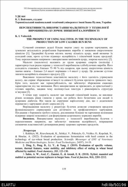 | Bibliographic citation (APA): | Voitovich, K. I. (2025). Perspektyvnist vykorystannia maltytolu u tekhnolohii vyrobnytstva bulochok znyzhenoi kaloriinosti [The prospect of using maltitol in the technology of production of low calorie bun buns]. Materials of the 8th International Scientific and Technical Conference “The State and Prospects of Food Science and Industry” dedicated to the 30th anniversary of the founding of the Department of Food Biotechnology and Chemistry at Ivan Pulʼuj Ternopil National Technical University, 25 – 26 veresnia 2025 y., Ternopil, 119. [in Ukrainian]. |