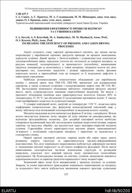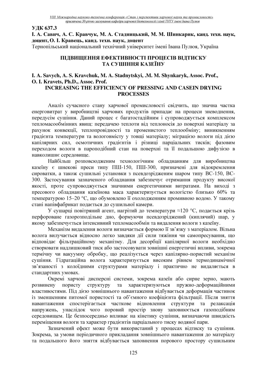 | Bibliographic citation (APA): | Savych, I. A., Kravchuk, A. S., Stadnytskyi, M. A., Shynkaryk, M. M., & Kravets, O. I. (2025). Pidvyshchennia efektyvnosti protsesiv vidtysku ta sushinnia kazeinu [Increasing the efficiency of pressing and casein drying processes]. Materials of the 8th International Scientific and Technical Conference “The State and Prospects of Food Science and Industry” dedicated to the 30th anniversary of the founding of the Department of Food Biotechnology and Chemistry at Ivan Pulʼuj Ternopil National Technical University, 25 – 26 veresnia 2025 y., Ternopil, 125-126. [in Ukrainian]. |