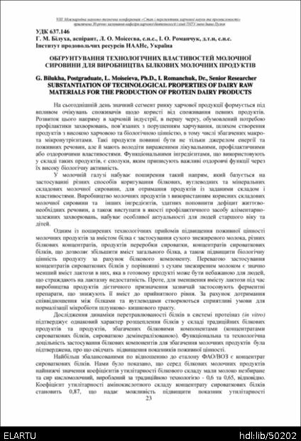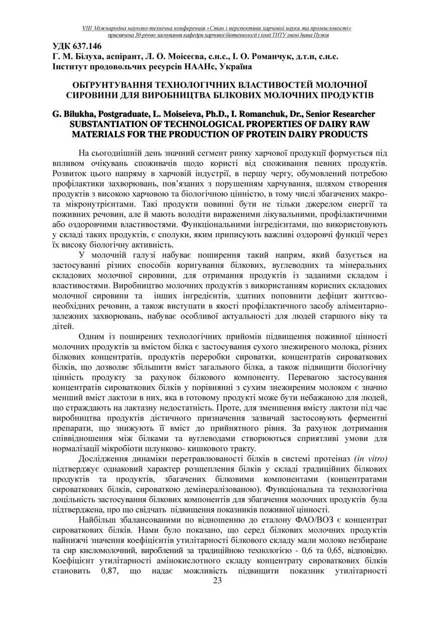 | Bibliographic citation (APA): | Bilukha, G., Moiseieva, L., & Romanchuk, I. (2025). Obgruntuvannia tekhnolohichnykh vlastyvostei molochnoi syrovyny dlia vyrobnytstva bilkovykh molochnykh produktiv [Substantiation of technological properties of dairy raw materials for the production of protein dairy products]. Materials of the 8th International Scientific and Technical Conference “The State and Prospects of Food Science and Industry” dedicated to the 30th anniversary of the founding of the Department of Food Biotechnology and Chemistry at Ivan Pulʼuj Ternopil National Technical University, 25 – 26 veresnia 2025 y., Ternopil, 23-24. [in Ukrainian]. |