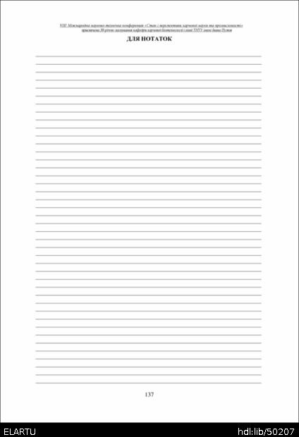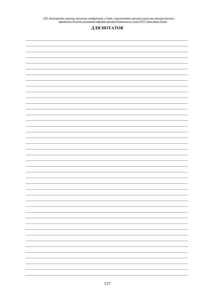 | Bibliographic citation (CHICAGO): | Dlia notatok [For notes]. Materials of the 8th International Scientific and Technical Conference “The State and Prospects of Food Science and Industry” dedicated to the 30th anniversary of the founding of the Department of Food Biotechnology and Chemistry at Ivan Pulʼuj Ternopil National Technical University (Tern., 25 – 26 veresnia 2025 y.), pp. 137 [in Ukrainian]. |