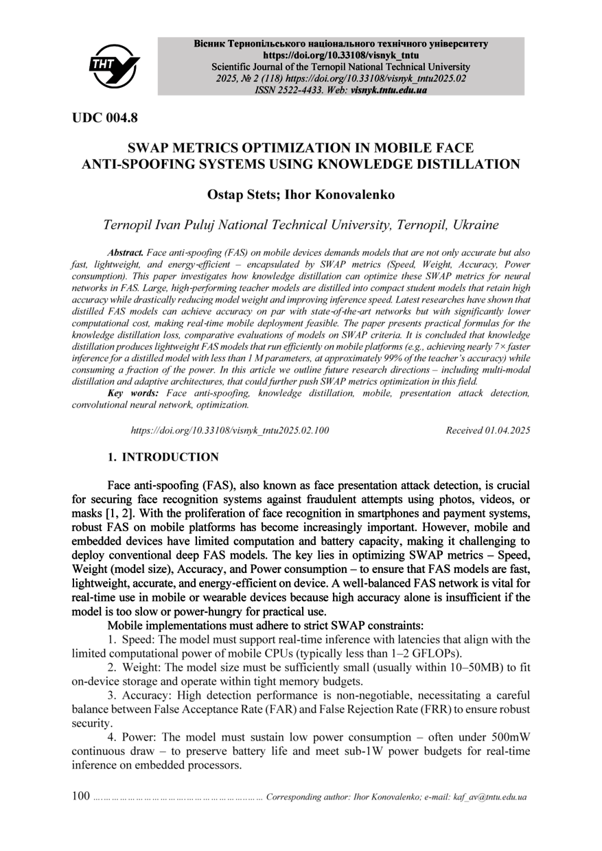 | Bibliographic citation (APA): | Stets, O., & Konovalenko, I. (2025). SWAP metrics optimization in mobile face anti-spoofing systems using knowledge distillation. Scientific journal of the ternopil national technical university, 118(2), 100-108. TNTU.. |