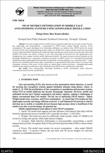 | Бібліографічне посилання: | Stets O., Konovalenko I. SWAP metrics optimization in mobile face anti-spoofing systems using knowledge distillation // Scientific Journal of TNTU, Ternopil. 2025. Vol 118. No 2. P. 100–108. |