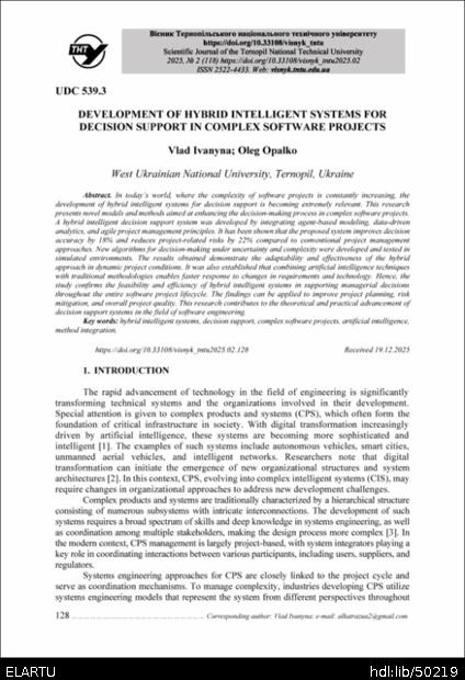 | Bibliographic citation (APA): | Ivanyna, V., & Opalko, O. (2025). Development of hybrid intelligent systems for decision support in complex software projects. Scientific journal of the ternopil national technical university, 118(2), 128-137. TNTU.. |