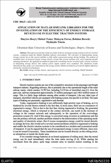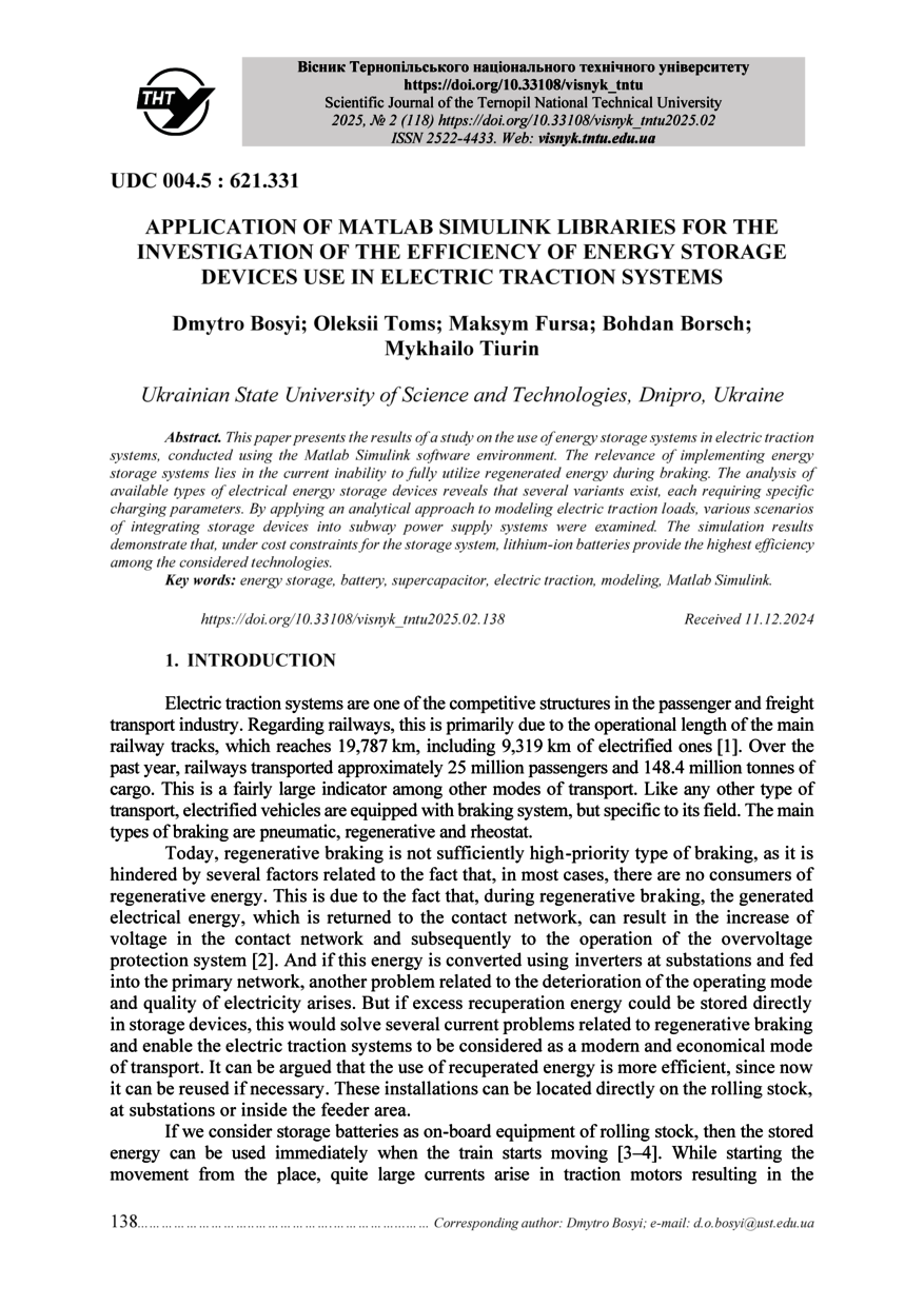 | Bibliographic citation (APA): | Bosyi, D., Toms, O., Fursa, M., Borsch, B., & Tiurin, M. (2025). Application of Matlab Simulink libraries for the investigation of the efficiency of energy storage devices use in electric traction systems. Scientific journal of the ternopil national technical university, 118(2), 138-152. TNTU.. |