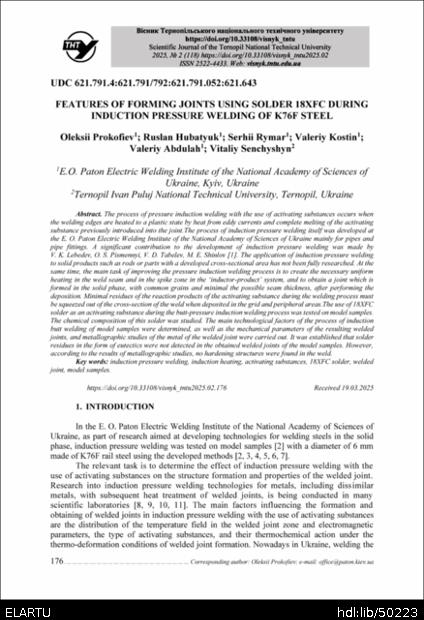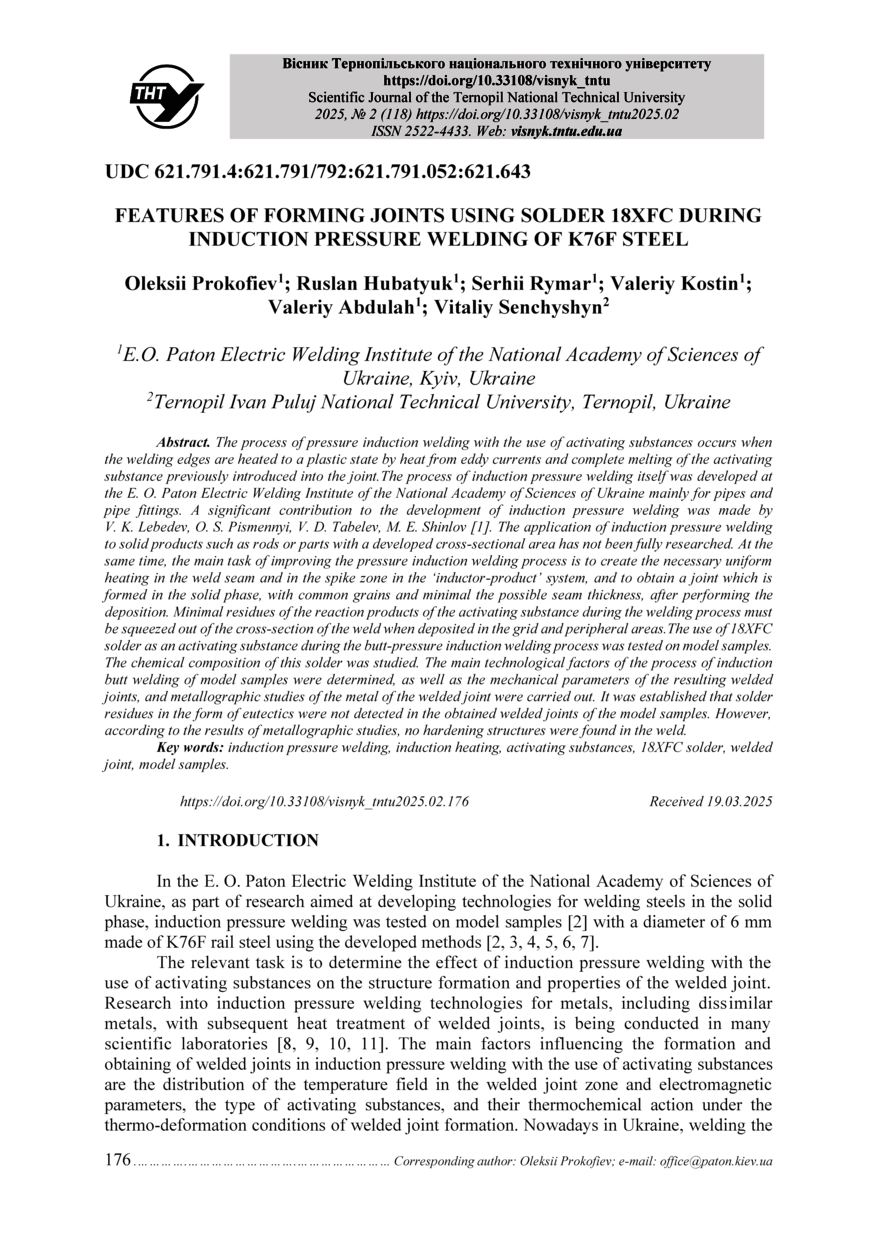 | Bibliographic citation (APA): | Prokofiev, O., Hubatyuk, R., Rymar, S., Kostin, V., Abdulah, V., & Senchyshyn, V. (2025). Features of forming joints using solder 18XFC during induction pressure welding of K76F steel. Scientific journal of the ternopil national technical university, 118(2), 176-189. TNTU.. |